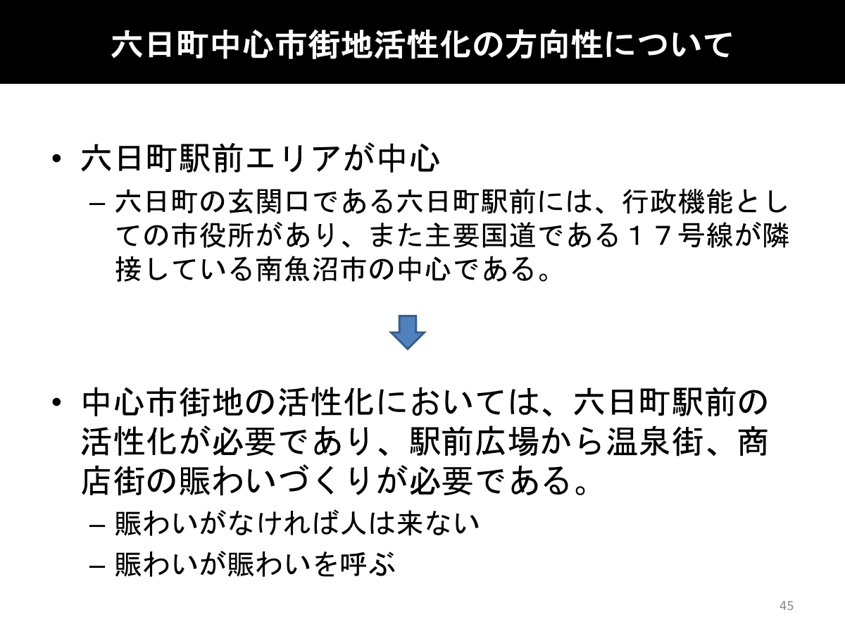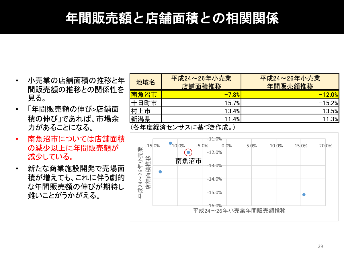 全国的に苦境の続く商業環境の中、六日町は非常に厳しい商業環境となっています。店舗面積1㎡当たりの支持人口は全国平均の0.94人に対して、六日町は0.6人となっています。また、商圏人口においては、六日町駅を起点とする500m圏においては、小さい食品スーパーが成り立つ人口も有しておらずコンビニサイズの人口しかいない現状です。南魚沼市の小売中心性指数が107.5%と市内だけでなく広域から消費需要が流入していることを示していますが、基本的には大型店が中心となって市の拠点性を支えている構図となっており、小売業に係る市場余力は限定的とあると推測されます。