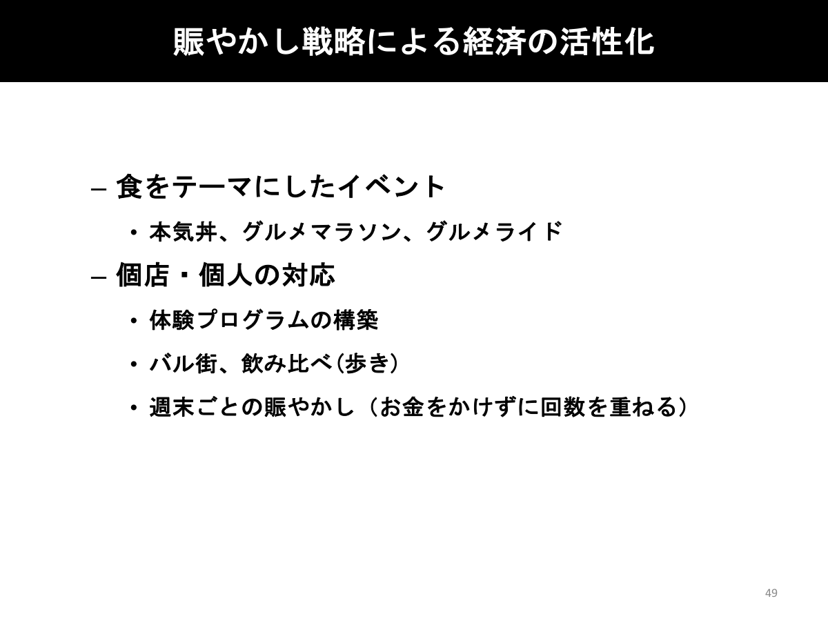 このように、人口減少により商業環境が一層厳しくなる中、交流人口の増加によるまちづくりが必要であると考えます。地域の多様な資源を活かして活動する多様な人たちが主役となり、「住んでよし、訪れてよし」の理念に基づいた滞在交流型観光を目指し、「まち歩き」「体験」「住民との交流」を通してお客様を増やし、お客様に滞在して回遊してもらい、お金を落としていただくことにより、まちを活性化させたいと考えます。